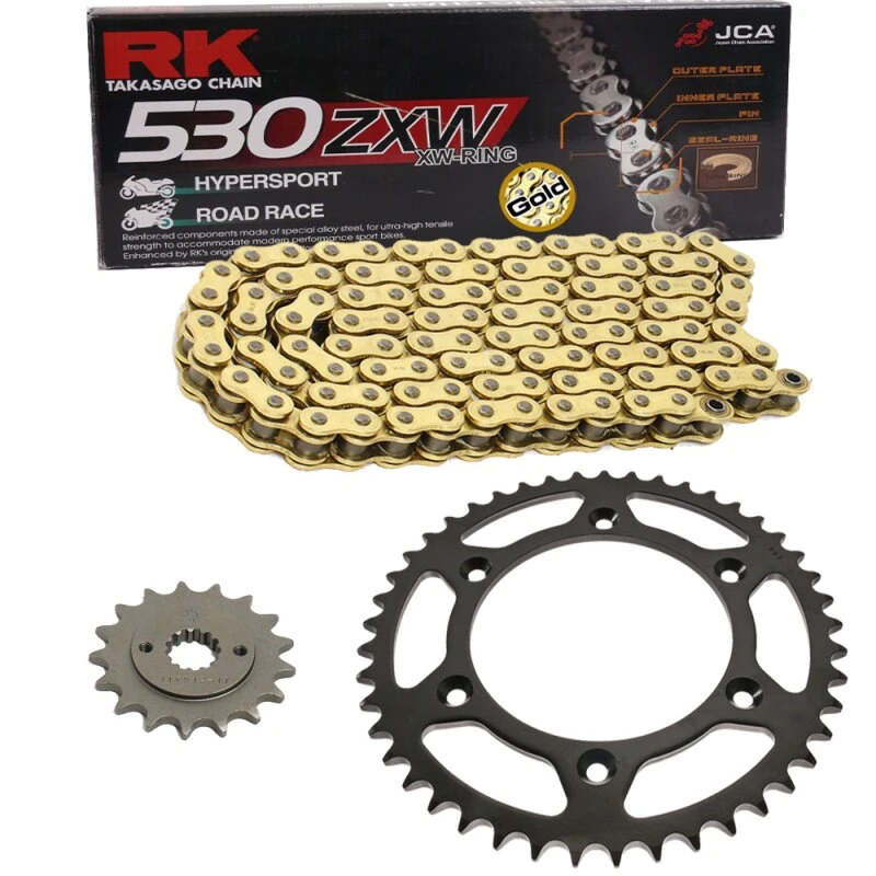 Der Kettensatz enthält eine hochwertige Motorradkette von dem japanischen Erstausrüster RK Takasago Chain, zu dessen herausragenden Eigenschaften die hohe Fertigungsqualität und Haltbarkeit gehören. Eine erstklassige Motorradkette sollte immer auch mit absolut hochwertigen Kettenrädern kombiniert werden.