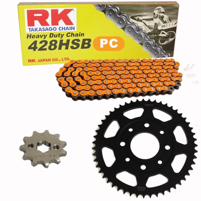 Der Kettensatz enthält eine hochwertige Motorradkette von dem japanischen Erstausrüster RK Takasago Chain, zu dessen herausragenden Eigenschaften die hohe Fertigungsqualität und Haltbarkeit gehören. Eine erstklassige Motorradkette sollte immer auch mit absolut hochwertigen Kettenrädern kombiniert werden.