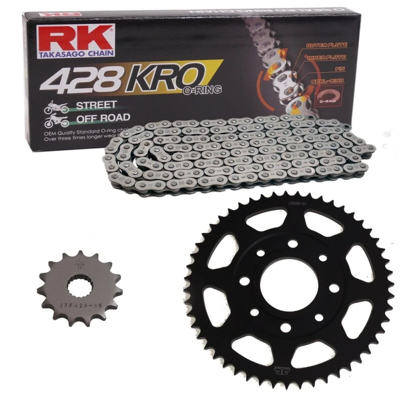 Der Kettensatz enthält eine hochwertige Motorradkette von dem japanischen Erstausrüster RK Takasago Chain, zu dessen herausragenden Eigenschaften die hohe Fertigungsqualität und Haltbarkeit gehören. Eine erstklassige Motorradkette sollte immer auch mit absolut hochwertigen Kettenrädern kombiniert werden.