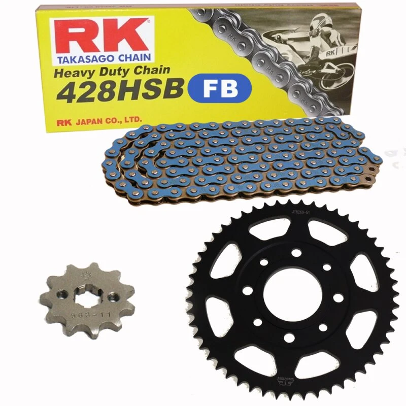 Der Kettensatz enthält eine hochwertige Motorradkette von dem japanischen Erstausrüster RK Takasago Chain, zu dessen herausragenden Eigenschaften die hohe Fertigungsqualität und Haltbarkeit gehören. Eine erstklassige Motorradkette sollte immer auch mit absolut hochwertigen Kettenrädern kombiniert werden.