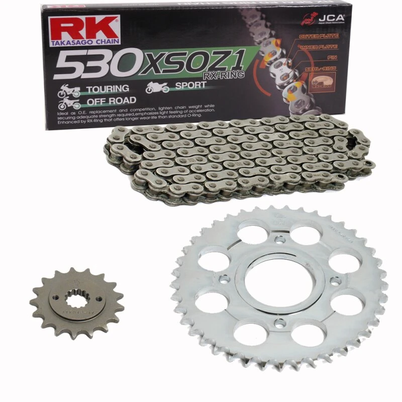 Der Kettensatz enthält eine hochwertige Motorradkette von dem japanischen Erstausrüster RK Takasago Chain, zu dessen herausragenden Eigenschaften die hohe Fertigungsqualität und Haltbarkeit gehören. Eine erstklassige Motorradkette sollte immer auch mit absolut hochwertigen Kettenrädern kombiniert werden.