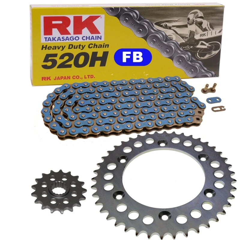 Der Kettensatz enthält eine hochwertige Motorradkette von dem japanischen Erstausrüster RK Takasago Chain, zu dessen herausragenden Eigenschaften die hohe Fertigungsqualität und Haltbarkeit gehören. Eine erstklassige Motorradkette sollte immer auch mit absolut hochwertigen Kettenrädern kombiniert werden.