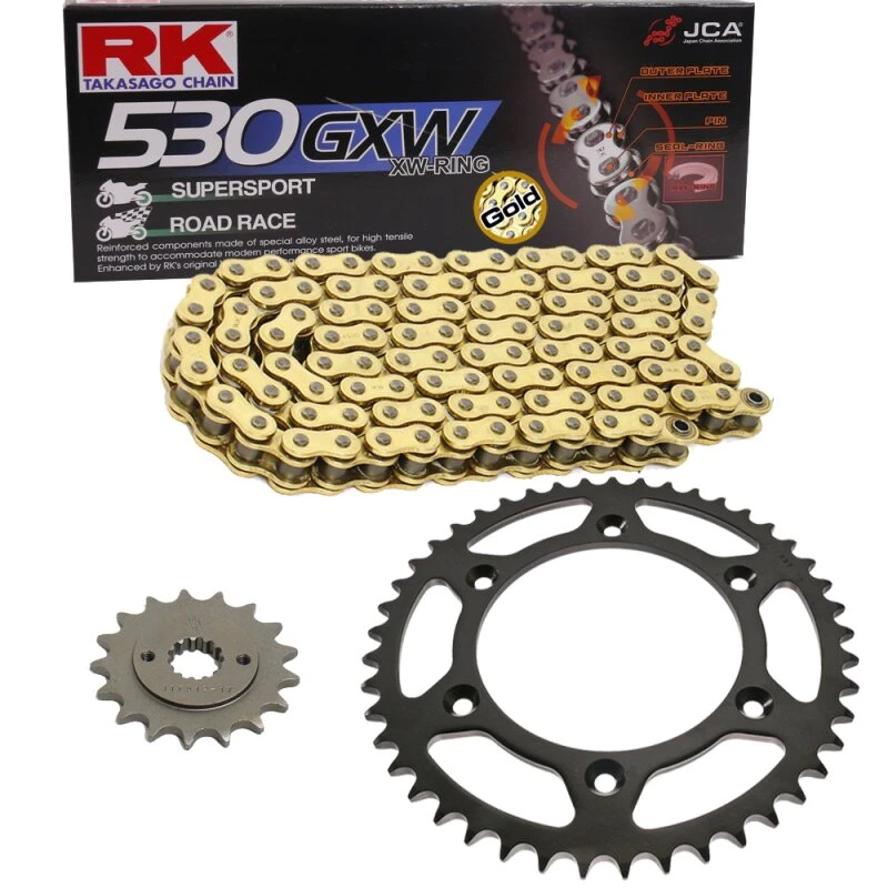 Der Kettensatz enthält eine hochwertige Motorradkette von dem japanischen Erstausrüster RK Takasago Chain, zu dessen herausragenden Eigenschaften die hohe Fertigungsqualität und Haltbarkeit gehören. Eine erstklassige Motorradkette sollte immer auch mit absolut hochwertigen Kettenrädern kombiniert werden.