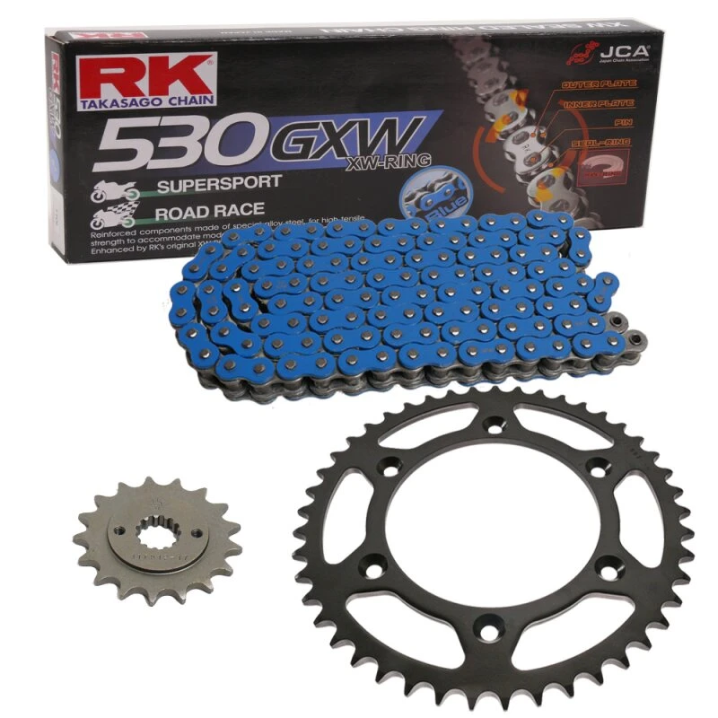 Der Kettensatz enthält eine hochwertige Motorradkette von dem japanischen Erstausrüster RK Takasago Chain, zu dessen herausragenden Eigenschaften die hohe Fertigungsqualität und Haltbarkeit gehören. Eine erstklassige Motorradkette sollte immer auch mit absolut hochwertigen Kettenrädern kombiniert werden.